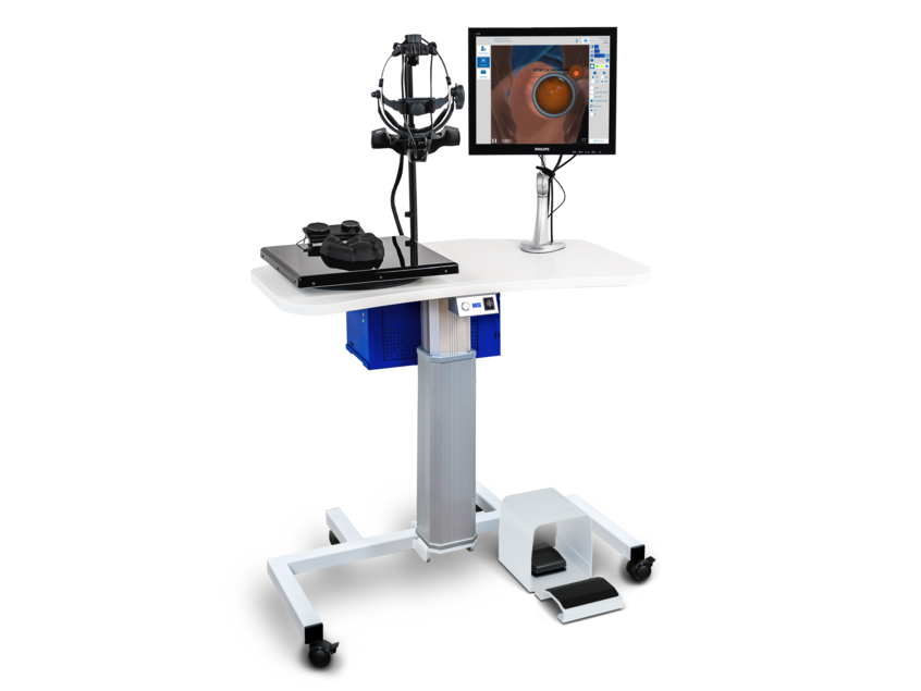 Eyesi Indirect Ophthalmoscope ROP Simulator(Eyesi Indirect ROP)は、適切なデバイス操作を習得するための高度に没入型なトレーニング環境を提供する、複合現実シミュレータです。本シミュレータは、実際の検査シナリオにおけるあらゆる重要な要素を再現します。システムは、眼底鏡を模したヘッドマウント型ステレオディスプレイ、眼を備えた患者モデルの頭部、レンズおよび圧迫子(スクレラル・ディプレッサー)の模擬器具で構成されています。ユーザーは、患者の目の3Dシミュレーション映像を通じて、間接眼底鏡模擬器、手持ちレンズ、患者の眼を正確に位置合わせする必要があり、これにより網膜を観察することができます。さらに、より現実に近い没入感を高めるため、スクレラル・ディプレッサーを使って眼を圧迫し、様々な方向に傾けることが可能で、その操作による影響はリアルタイムで再現されます。